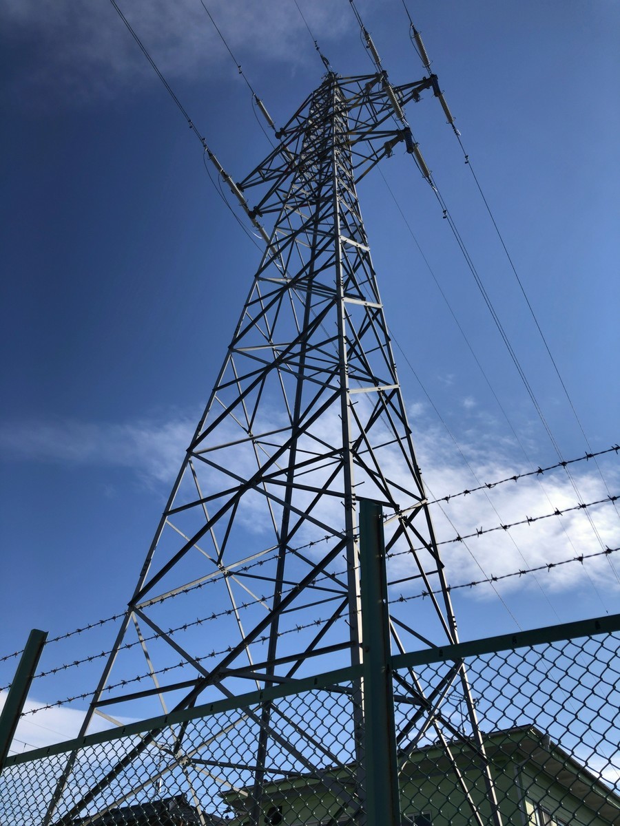 鉄塔が空へ伸びる。鉄塔岩沼支線4。ということは近くに変電所があるんだね。